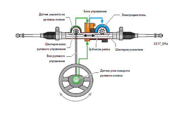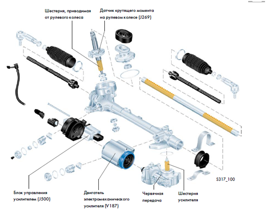 На борту рейки є декілька датчиків - це датчик моменту, датчик положення двигуна. На рейці 1К0 встановлений на борту датчика моменту датчик кута повороту керма, а блок керування в цій рейці цілісний з електро двигуном.