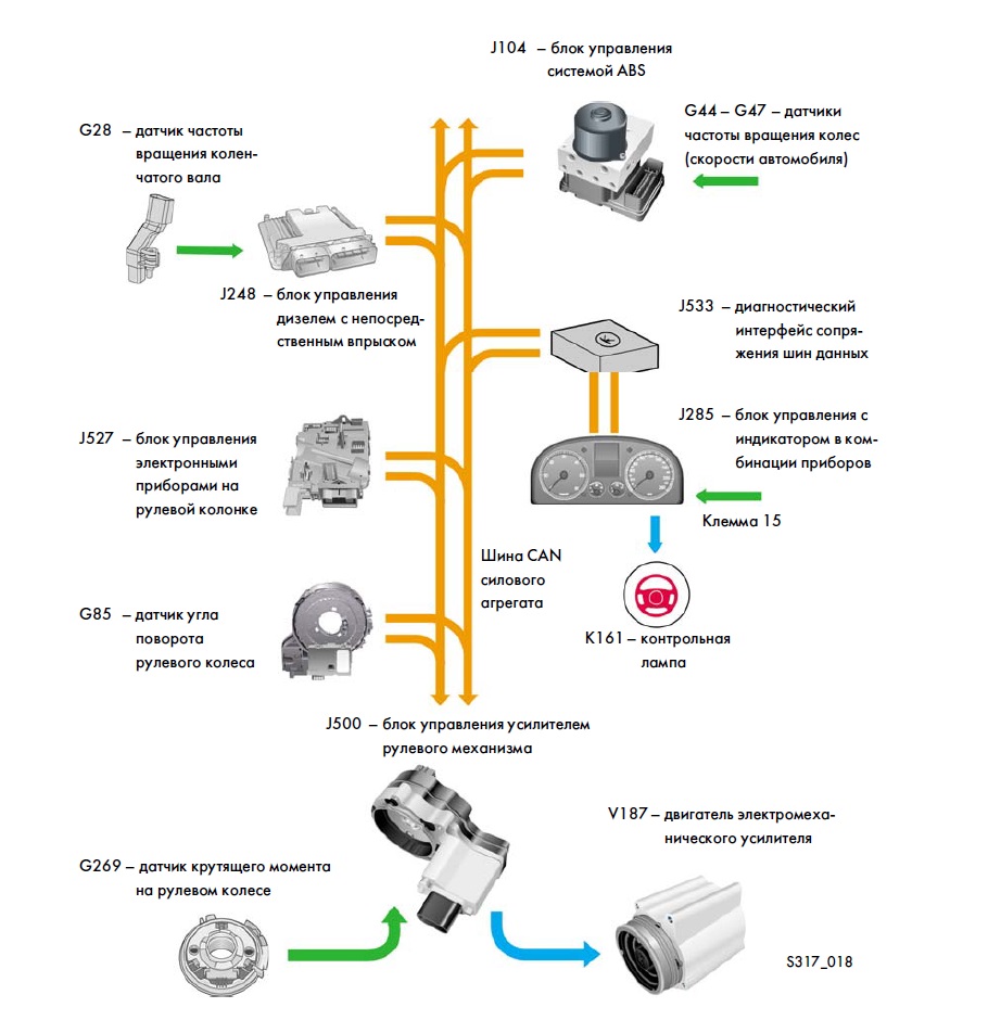Блок керування рейки взаємодіє з рядом датчиків і блоків автомобіля. Завдяки цьому відбувається корекція сили підсилення на різних режимах роботи автомобіля. Фото №3