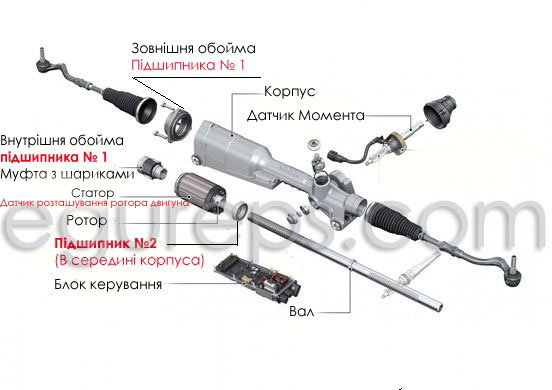 Підшипники створюють шум під час повороту керма (дивіться на зображення №1). Підшипник № 1 виконаний суцільно з корпусом. Хочемо зазначити, що компанія Egureps здійснює реставрацію та заміну таких підшипників. Рішення щодо ремонту агрегату ми приймаємо лише після діагностики та в залежності від його стану. Ми замінюємо підшипники на нові, а також використовуємо комплектуючі з агрегатів донорів.